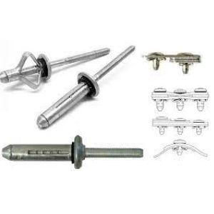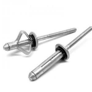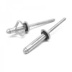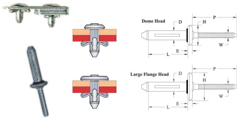 The B-tite rivet body folds into three separate legs forming a large blind-side head. This large bearing head evenly distributes the Bulb-Tite Rivet high clamp force in soft, thin, or brittle materials while providing high pull-through resistance. B-tite rivets generally come with a neoprene rubber washer. These are developed to solve application requirements in the pre-engineered metal building, roofing, and siding industry.